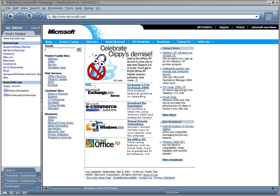 Dann Sheridan sends screen shots of Mozilla 0.9 on Linux, viewing Scripting News, Microsoft, and Apple.